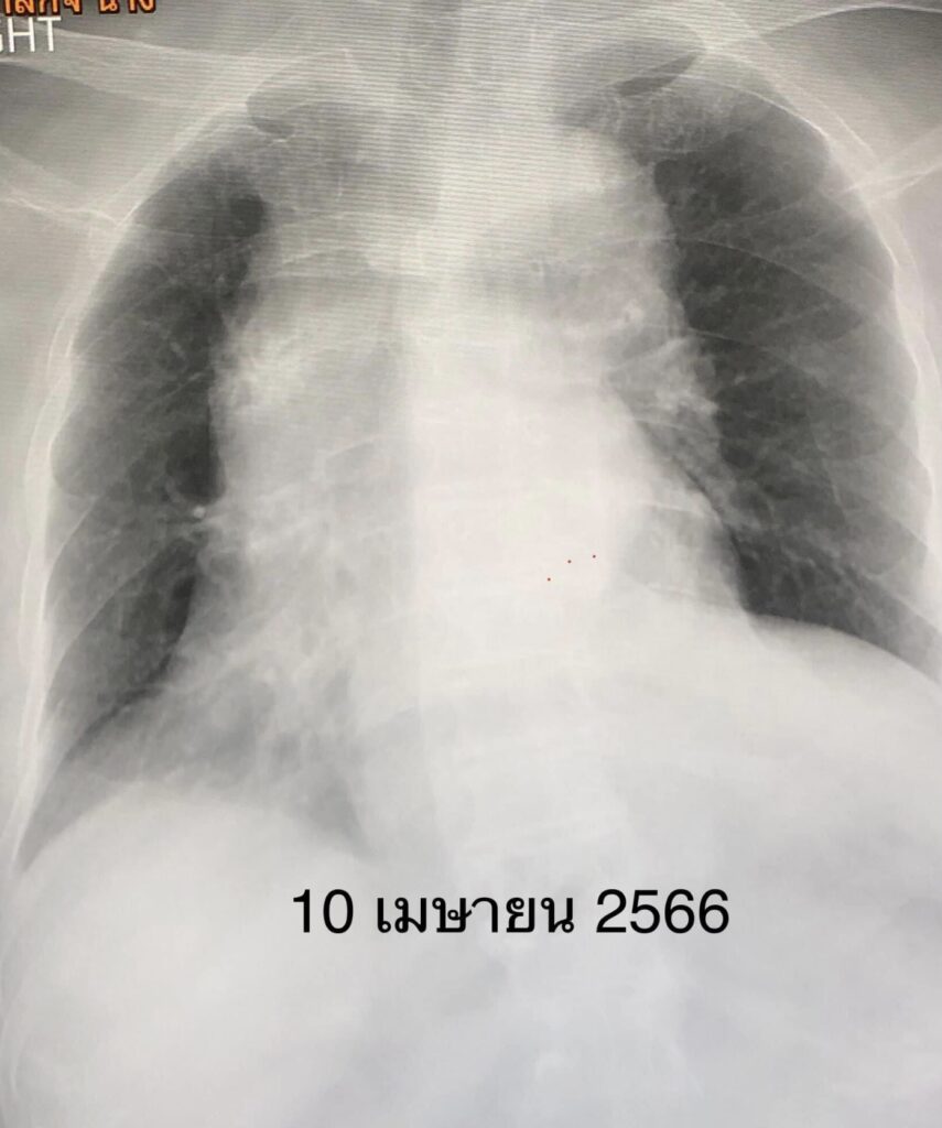 เริ่มไอ 2 วัน เหนื่อยเล็กน้อย ไม่มีไข้ ไม่เจ็บคอ ไม่มีน้ำมูก ตรวจ ATK บวก ติดเชื้อไวรัสโควิดครั้งแรกจากคนเฝ้าและลูกสาวที่อยู่ในบ้านเดียวกัน ผู้ป่วยรู้ตัวดี พูดได้ ไม่มีไข้ เอกซเรย์ปอดปกติ (ดูรูป) รับเข้านอนในโรงพยาบาลวันที่ 10 เมษายน 2566 เริ่มยาต้านไวรัสเรมเดซิเวียร์ฉีดเข้าเส้นเลือด