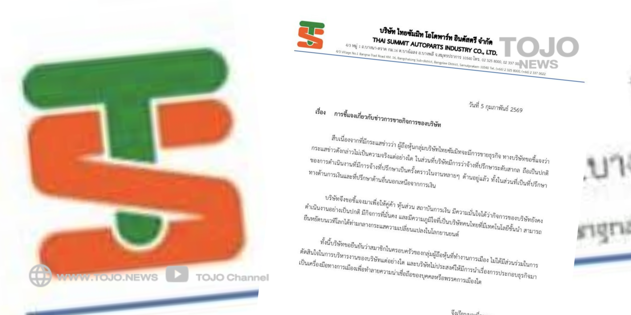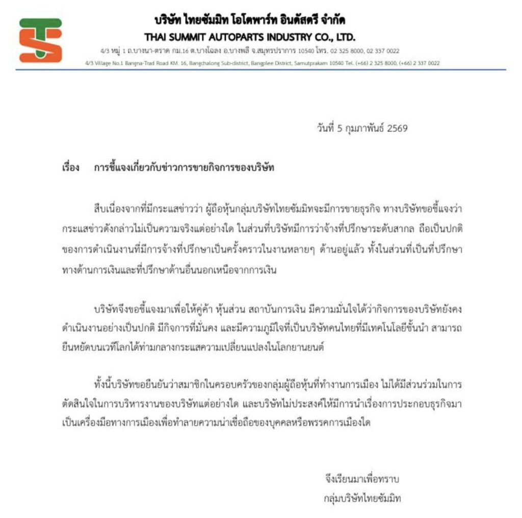 ผู้สื่อข่าวโตโจ้นิวส์รายงานว่า กลุ่มบริษัทไทยซัมมิท ออกแถลงการณ์ ชี้แจง “สืบเนื่องจากที่มีกระแสข่าวว่า ผู้ถือหุ้นกลุ่มบริษัทไทยซัมมิทจะมีการขายธุรกิจ