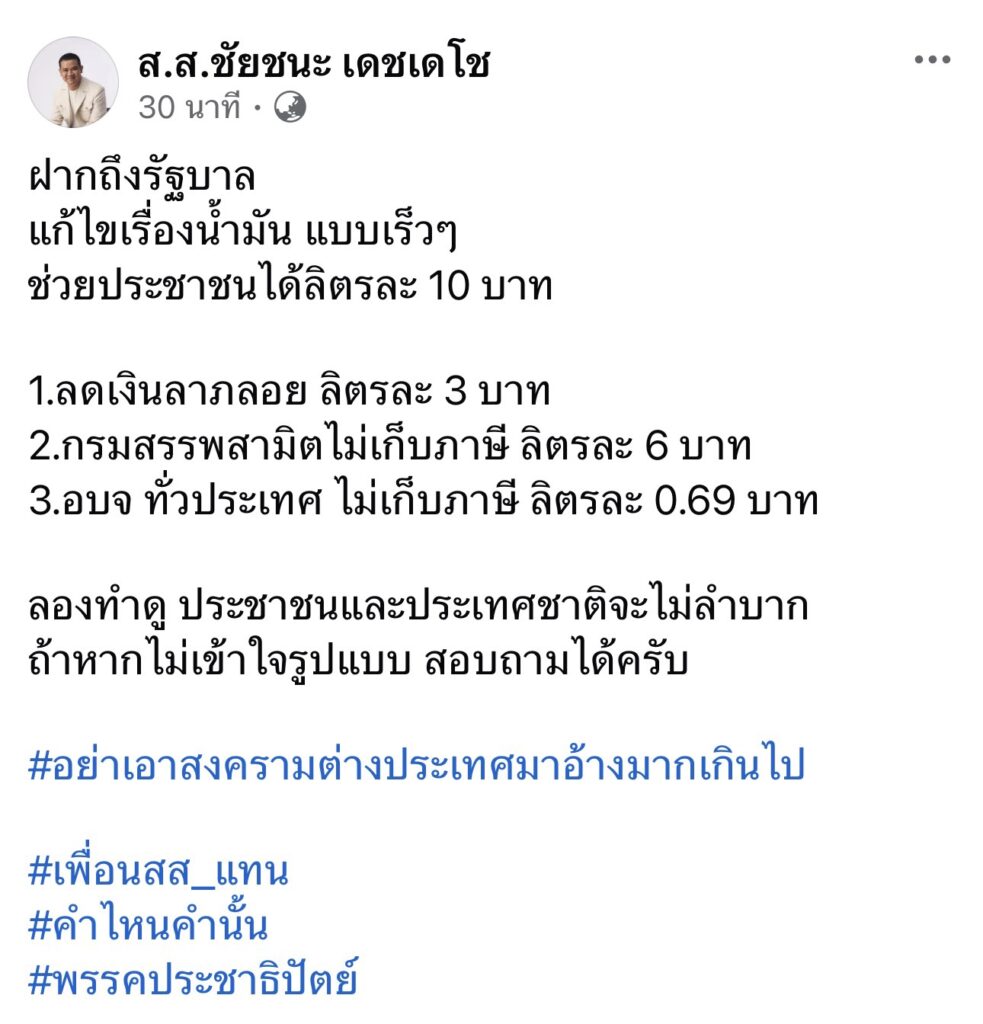 ผู้สื่อข่าวโตโจ้นิวส์รายงานว่า นายชัยชนะ เดชเดโช สมาชิกสภาผู้แทนราษฎรแบบบัญชีรายชื่อ และรองหัวหน้าพรรคประชาธิปัตย์ กล่าวถึงสถานการณ์ราคาน้ำมันที่เพิ่มสูงขึ้นในปัจจุบัน ว่า รัฐบาลต้องเร่งดำเนินมาตรการแก้ไขปัญหาราคาน้ำมันอย่างเร่งด่วน เพื่อบรรเทาภาระค่าครองชีพของประชาชน โดยได้เสนอ 3 แนวทางให้รัฐบาล เพื่อสามารถปรับลดราคาน้ำมันลงได้ประมาณลิตรละ 10 บาท เพื่อช่วยเหลือประชาชน ได้แก่
