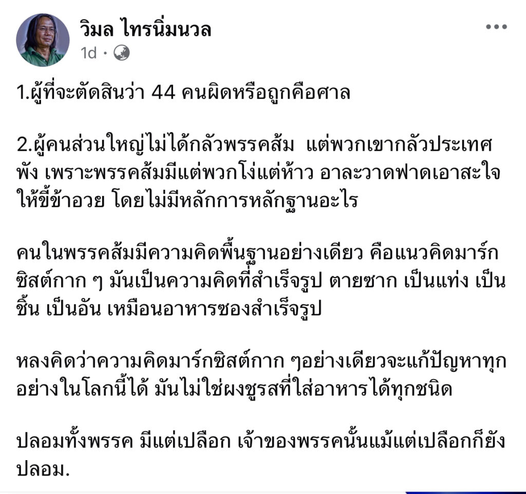 คนในพรรคส้มมีความคิดพื้นฐานอย่างเดียว คือแนวคิดมาร์กซิสต์กาก ๆ มันเป็นความคิดที่สำเร็จรูป ตายซาก เป็นแท่ง เป็นชิ้น เป็นอัน เหมือนอาหารซองสำเร็จรูป