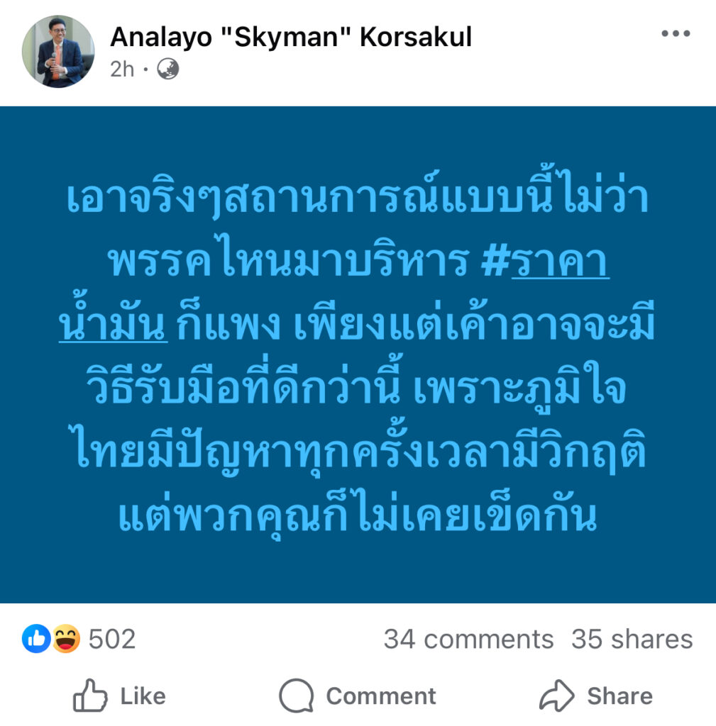 อนาลโย ฟาดยับ! คนเลือกภูมิใจไทย ไม่เคยเข็ดกัน ถ้าเป็นพรรคอื่นบริหารน้ำมันแพง จะมีวิธีที่ดีกว่านี้