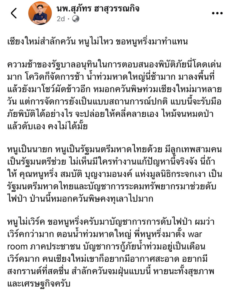 หมอสุภัทร โผล่ฟาดรัฐบาลอนุทิน คอนเฟิร์ม ทำงานช้าโดดเด่น ทั้งโควิด น้ำท่วม ตอนนี้ฝุ่นพิษ
