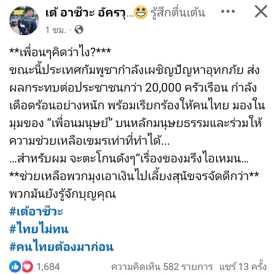 ผู้สื่อข่าวโตโจ้นิวส์รายงานว่า เต้ อาชีวะ อัครวุธ บุรณพนธ์ สมาชิกพรรคและแกนนำพรรคไทยไม่ทน โพสต์ระบุว่า…