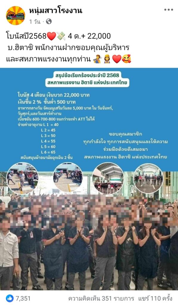 พนักงาน โรงงาน ฮิตาชิ ขอบคุณผู้บริหาร คนแห่เมนต์ชื่นชม ให้กำลังใจ