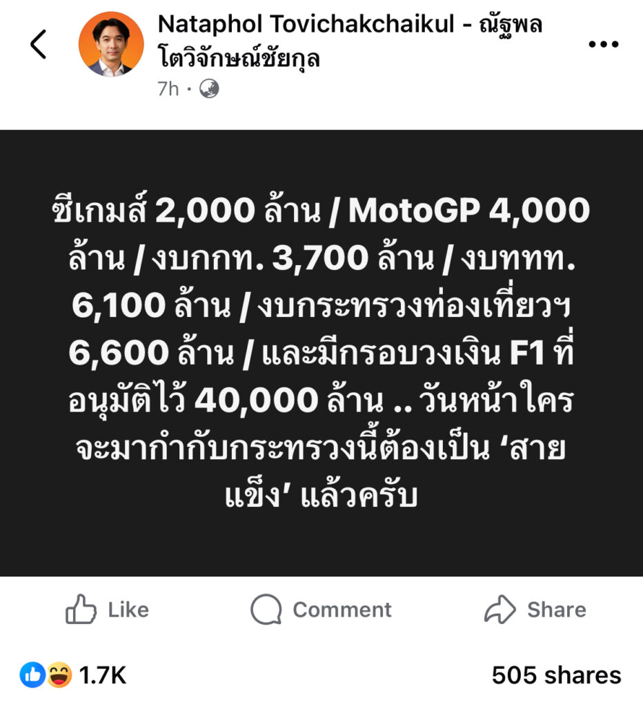 ซีเกมส์ 2,000 ล้าน / MotoGP 4,000 ล้าน / งบกกท. 3,700 ล้าน / งบททท. 6,100 ล้าน / งบกระทรวงท่องเที่ยวฯ 6,600 ล้าน / และมีกรอบวงเงิน F1 ที่อนุมัติไว้ 40,000 ล้าน .. วันหน้าใครจะมากำกับกระทรวงนี้ต้องเป็น ‘สายแข็ง’ แล้วครับ