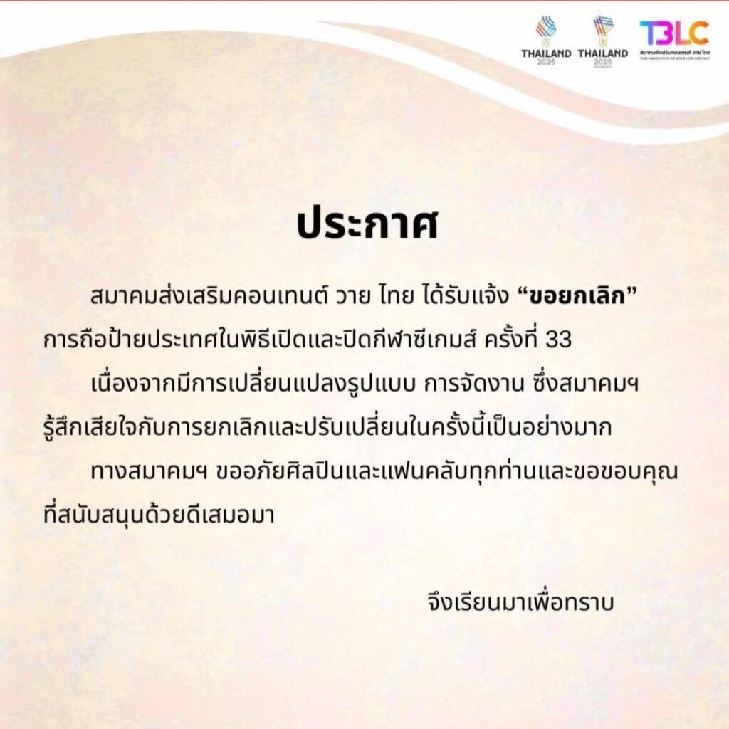 ผู้สื่อข่าวโตโจ้นิวส์รายงานว่า เมื่อวันที่ 5 ธ.ค.68 สมาคมส่งเสริมคอนเทนต์ วาย ไทย ได้รับแจ้ง “ขอยกเลิก” การถือป้ายประเทศในพิธีเปิดและปิดกีฬาซีเกมส์ ครั้งที่ 33 เนื่องจากมีการเปลี่ยนแปลงรูปแบบ การจัดงาน