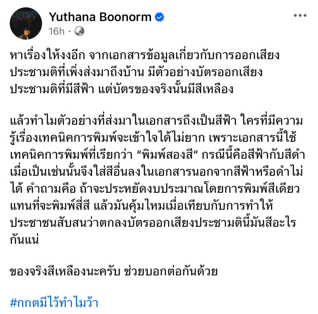 แล้วทำไมตัวอย่างที่ส่งมาในเอกสารถึงเป็นสีฟ้า ใครที่มีความรู้เรื่องเทคนิคการพิมพ์จะเข้าใจได้ไม่ยาก เพราะเอกสารนี้ใช้เทคนิคการพิมพ์ที่เรียกว่า “พิมพ์สองสี“ กรณีนี้คือสีฟ้ากับสีดำ เมื่อเป็นเช่นนั้นจึงใส่สีอื่นลงในเอกสารนอกจากสีฟ้าหรือดำไม่ได้ คำถามคือ ถ้าจะประหยัดงบประมาณโดยการพิมพ์สีเดียวแทนที่จะพิมพ์สี่สี แล้วมันคุ้มไหมเมื่อเทียบกับการทำให้ประชาชนสับสนว่าตกลงบัตรออกเสียงประชามตินี้มันสีอะไรกันแน่