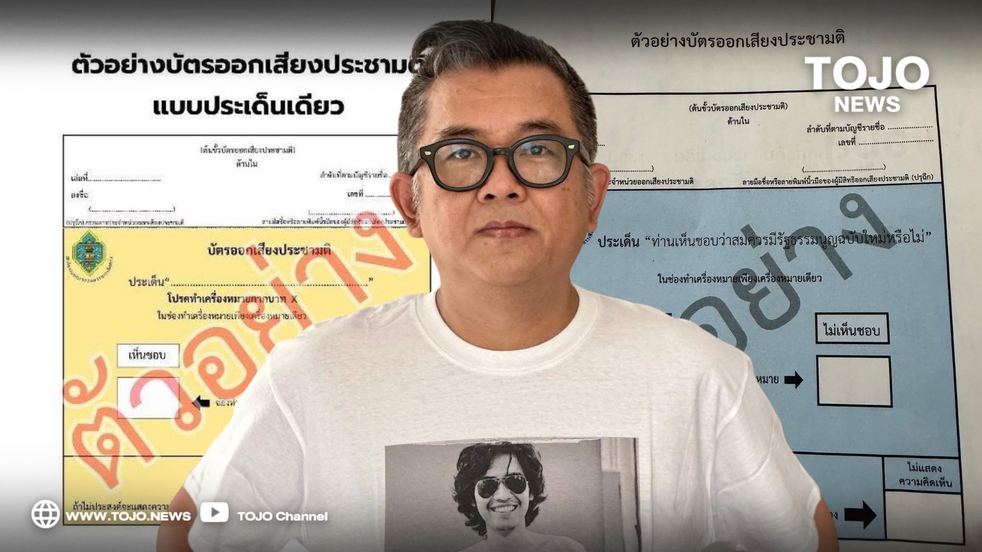 ป๋าเต็ด ติง การทำงานกกต. ใช้สีฟ้าในการพิมพ์ยกตัวอย่างบัตรประชามติ ทั้งที่วันจริงเป็นบัตรสีเหลือง