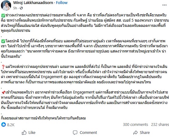 ข่าวลงว่าผมเจอประชาชนต่อว่าขณะหาเสียงที่ จ.ตาก คือ ข่าวที่ลงไม่ตรงกับความเป็นจริงเลยครับ คือ ระหว่างที่ผมเดินพบปะทักทายกับประชาชน กับคริษฐ์ ปานเนียม ผู้สมัคร สส. เบอร์ 5 ของพวกเรา ประชาชนส่วนใหญ่ก็ยิ้มแย้มแจ่มใส ต้อนรับพูดคุยกันเป็นอย่างดีนะครับ ไม่มีการโต้เถียงอะไรเลยครับตลอดการลงพื้นที่พูดคุยกับประชาชน