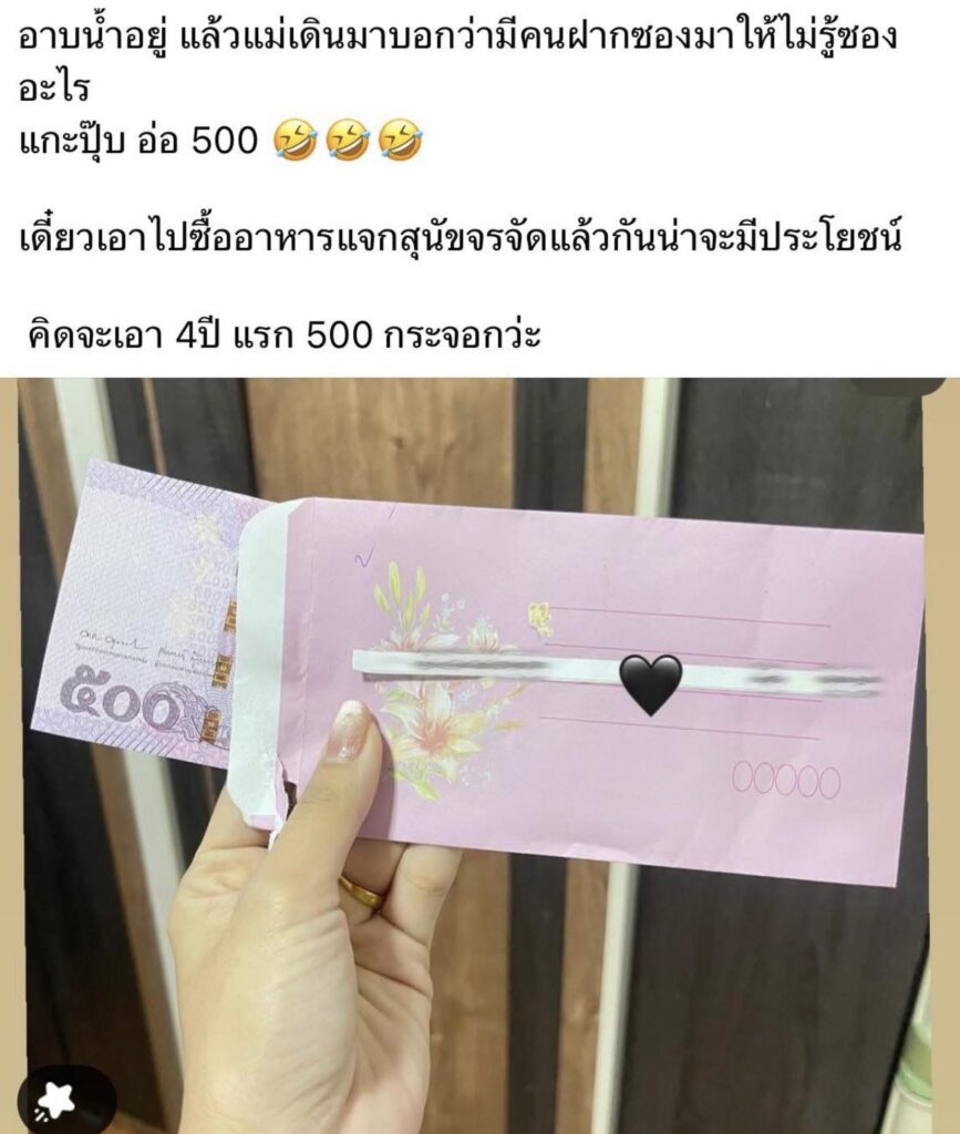 ผู้สือข่าวโตโจ้นิวส์รายงานว่า มีผู้ใช้เฟซบุ๊กรายหนึ่ง โพสต์รูปซองพร้อมเงิน 500 บาท พร้อมข้อความระบุว่า