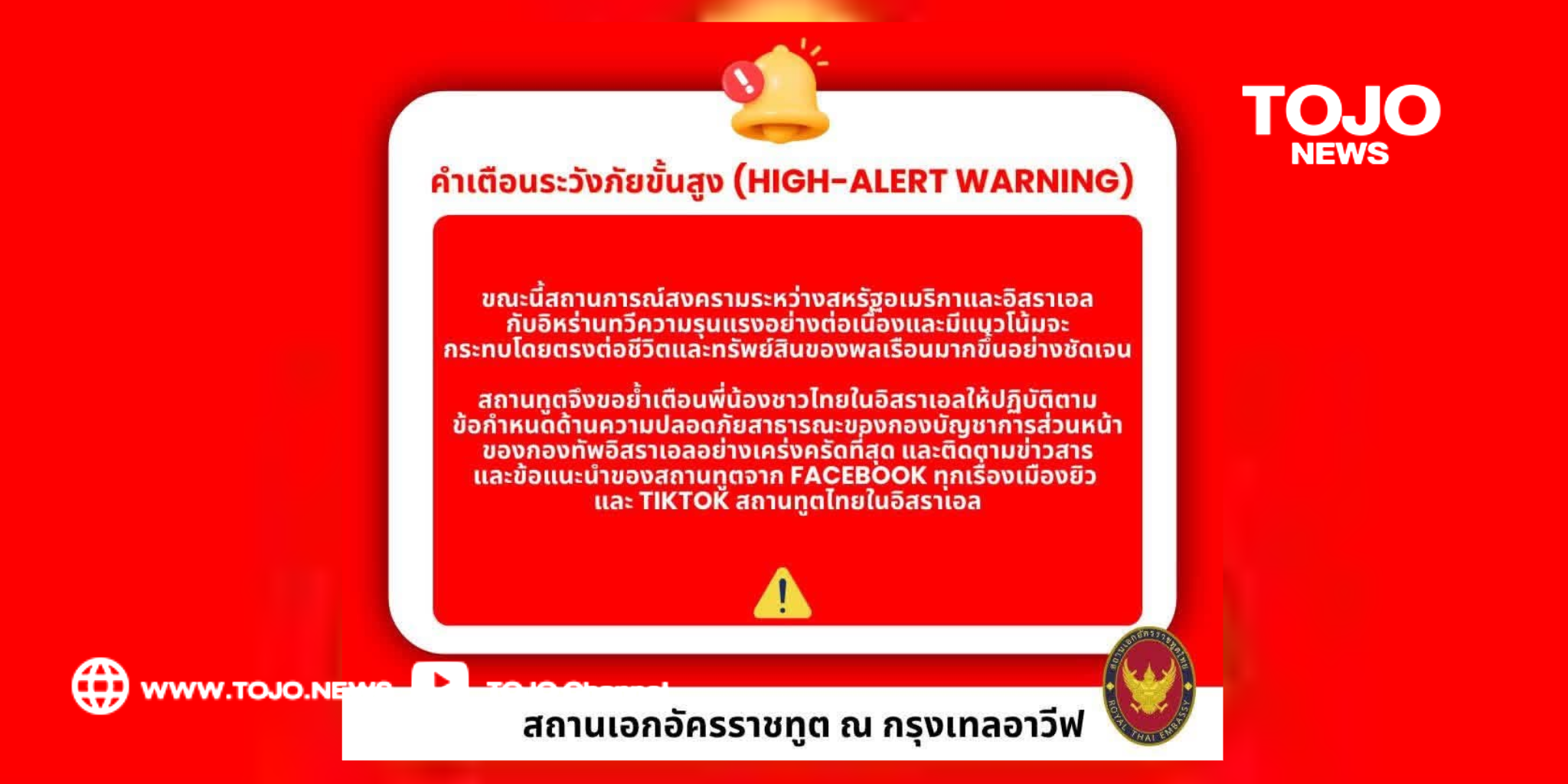 ผู้สื่อข่าวโตโจ้นิวส์รายงานว่า วันที่ 7 เม.ย.69 สถานเอกอัครราชทูต ณ กรุงเทลอาวีฟ ออกคำเตือนระวังภัยขั้นสูง สงครามระหว่างสหรัฐอเมริกาและอิสราเอลกับอิหร่านทวีความรุนแรง (HIGH-ALERT WARNING)โดยระบุว่า ขณะนี้สถานการณ์สงครามระหว่างสหรัฐอเมริกาและอิสราเอลกับอิหร่านทวีความรุนแรงอย่างต่อเนื่องและมีแนวโน้มจะกระทบโดยตรงต่อชีวิตและทรัพย์สินของพลเรือนมากขึ้นอย่างชัดเจน