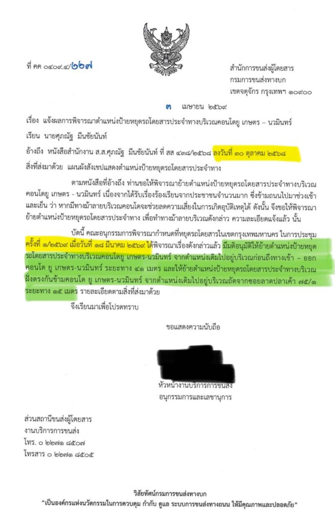 ผมจึงได้นัดหน่วยงานลงพื้นที่ เพื่อพิจารณาขยับป้ายรถเมล์ จนเรียบร้อยแล้ว และส่งหนังสือแจ้งขอขยับป้ายรถเมล์ 2 ป้าย – ขยับ 41 เมตร กับ 15 เมตร แต่กว่าเรื่องจะเข้าสู่คกก.พิจารณา จนได้รับการอนุมัติ กลับใช้เวลานานถึง 5 เดือน