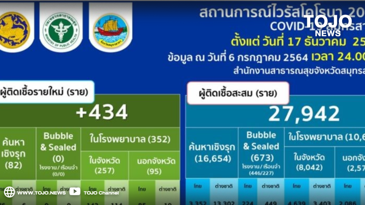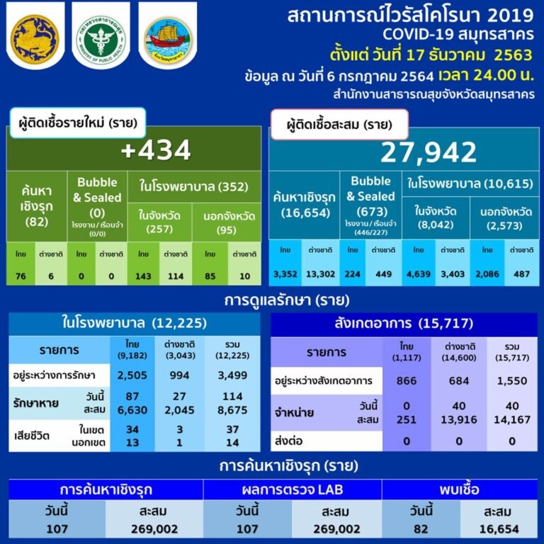 สมุทรสาคร รวมผู้ป่วยสะสม 27,942 ราย พบยอดรายใหม่ พรวดเดียว 434 นาย