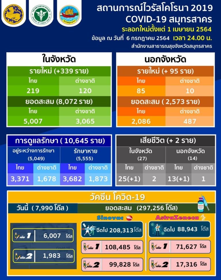 ผู้สื่อข่าวโตโจ้นิวส์รายงานว่า วันที่ 7 ก.ค. 64 สำนักงานสาธารณสุขจังหวัดสมุทรสาคร รายงานสถานการณ์ไวรัสโคโรนา 2019 (Covid-19 ) วันนี้พบผู้ติดเชื้อโควิดรายใหม่ จำนวน 434 ราย ผู้ป่วยรับการรักษาในโรงพยาบาล 3,499 ราย อยู่ระหว่างสังเกตอาการ 1,550 ราย รวมผู้ป่วยยืนยันสะสม 27,942 ราย หายป่วย/จำหน่ายแล้ว 22,842 ราย และวันนี้มีผู้เสียชีวิตจำนวน 2 ราย เสียชีวิตสะสม 51 ราย