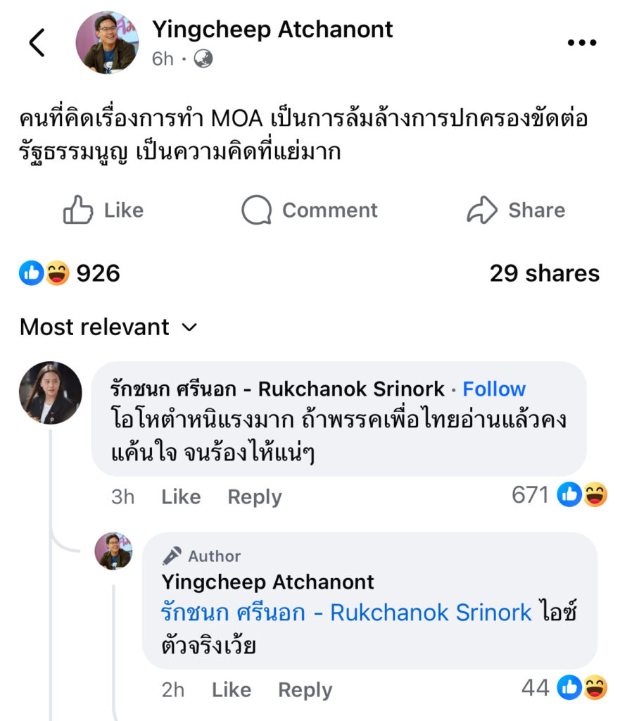 ยิ่งชีพ ตำหนิ คนที่บอก MOA ขัดต่อรัฐธรรมนูญ รักชนก คอมเมนต์ ถ้าเพื่อไทยอ่านคงแค้นใจ