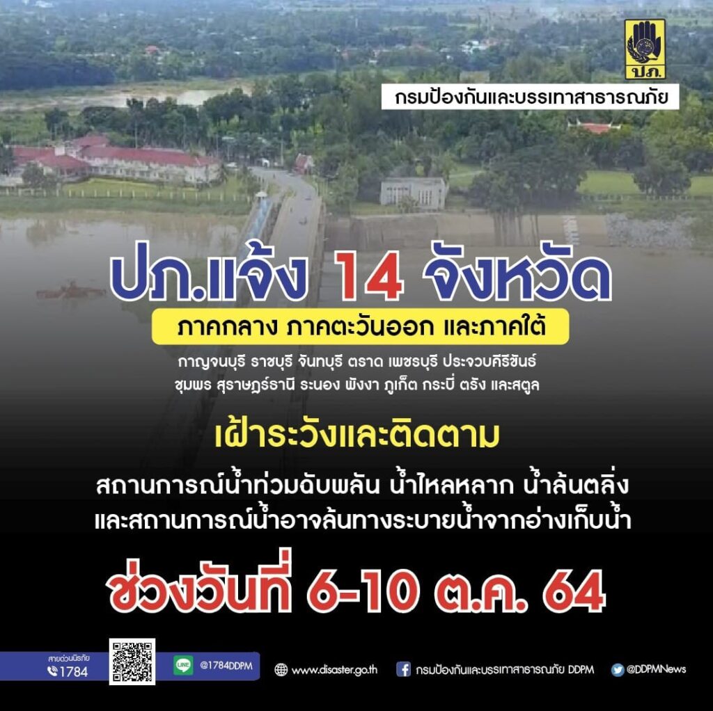 ผู้สื่อข่าวโตโจ้นิวส์รายงานว่า กรมป้องกันและบรรเทาสาธารณภัย หรือ ปภ. แจ้ง 14 จังหวัด ภาคกลาง ภาคตะวันออก และภาคใต้ ได้แก่ กาญจนบุรี ราชบุรี จันทบุรี ตราด เพชรบุรี ประจวบคีรีขันธ์ ชุมพร สุราษฎร์ธานี ระนอง พังงา ภูเก็ต กระบี่ ตรัง และสตูล เฝ้าระวังและติดตามสถานการณ์น้ำท่วมฉับพลัน น้ำไหลหลาก น้ำล้นตลิ่ง และสถานการณ์น้ำอาจล้นทางระบายน้ำจากอ่างเก็บน้ำ ในช่วงวันที่ 6-10 ตุลาคม 2564 หลังได้รับแจ้งจากกองอำนวยการน้ำแห่งชาติว่า ได้ประเมินสถานการณ์น้ำจากฝนคาดการณ์ของกรมอุตุนิยมวิทยาและสถาบันสารสนเทศทรัพยากรน้ำ (องค์การมหาชน) พบว่า มีพื้นที่เสี่ยงฝนตกหนัก เฝ้าระวังน้ำไหลหลาก และน้ำท่วมฉับพลัน ในช่วงเวลาดังกล่าว