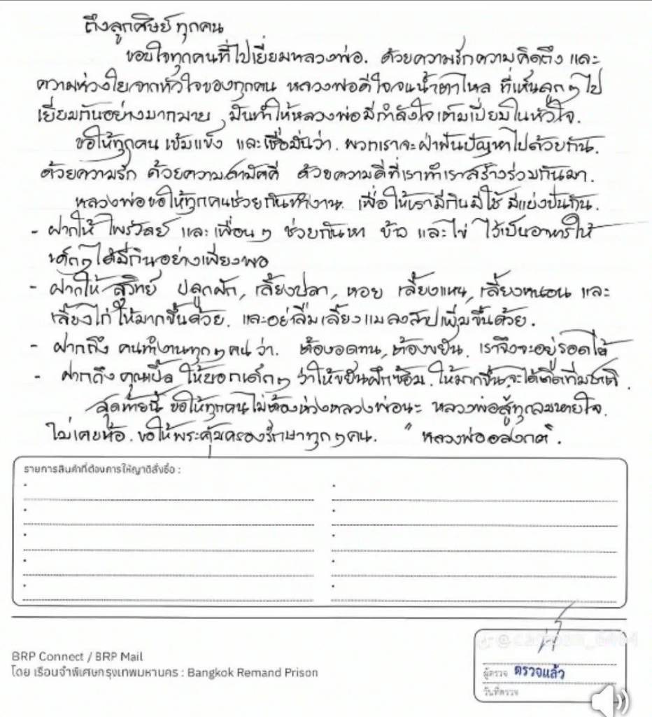 อดีตพระอลงกต เขียนจดหมายด้วยลายมือถึงลูกศิษย์ ขอให้ทุกคนเข้มแข็ง จะผ่านปัญหาไปด้วยกัน