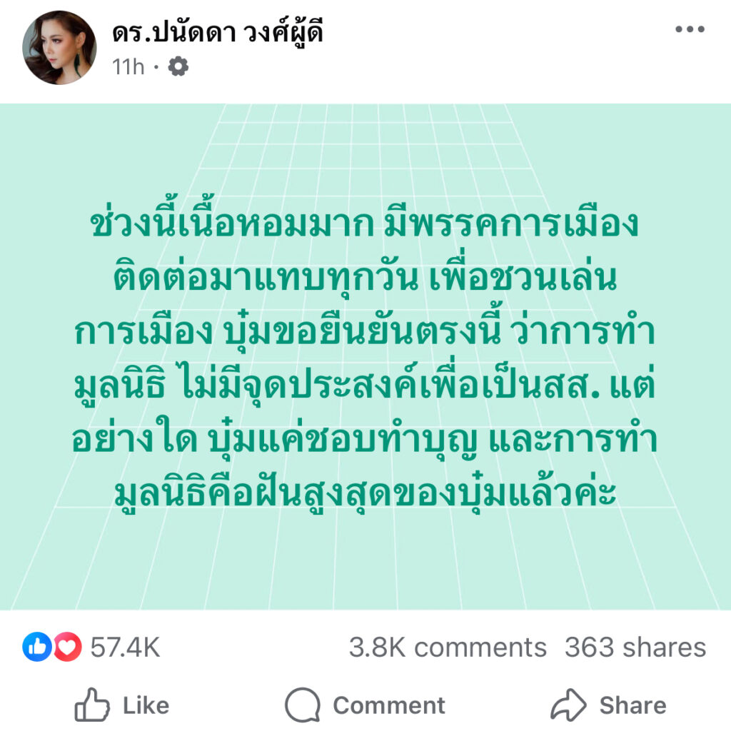 ช่วงนี้เนื้อหอมมาก มีพรรคการเมืองติดต่อมาแทบทุกวัน เพื่อชวนเล่นการเมือง บุ๋มขอยืนยันตรงนี้ ว่าการทำมูลนิธิ ไม่มีจุดประสงค์เพื่อเป็นสส. แต่อย่างใด บุ๋มแค่ชอบทำบุญ และการทำมูลนิธิคือฝันสูงสุดของบุ๋มแล้วค่ะ