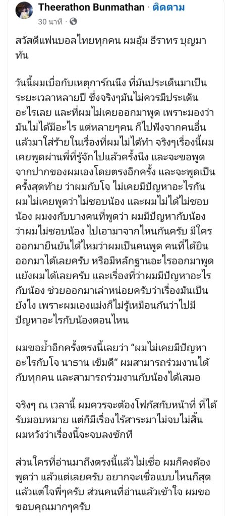 ผู้สื่อข่าวโตโจ้นิวส์รายงานว่า เมื่อวันที่ 6 พ.ย.68 อุ้ม ธีราทร บุญมาทัน นักฟุตบอลอาชีพชื่อดัง โพสต์ข้อความผ่านเฟซบุ๊กส่วนตัว ระบุว่า…