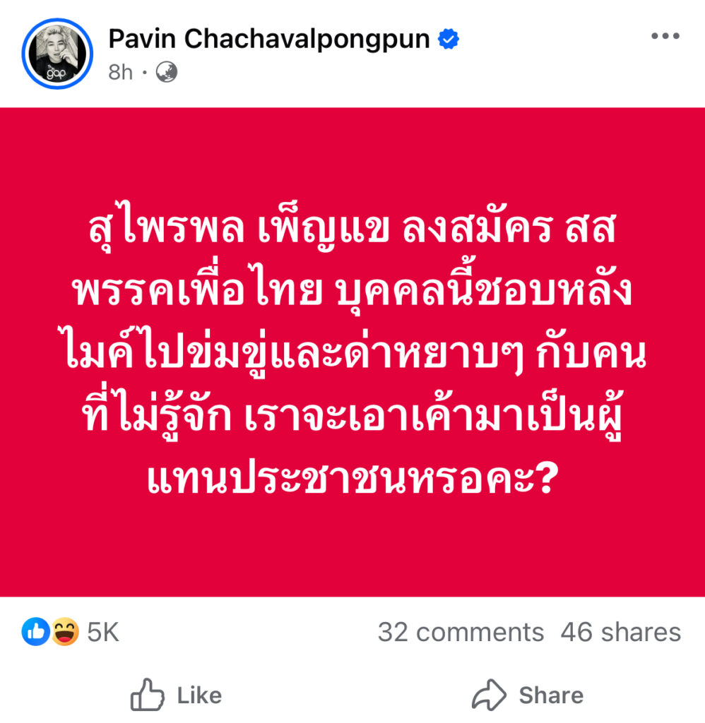 ปวิน ลั่น สุไพรพล ชอบหลังไมค์ไปข่มขู่ ถาม จะเอาคนแบบนี้เป็นผู้แทนประชาชนเหรอ?