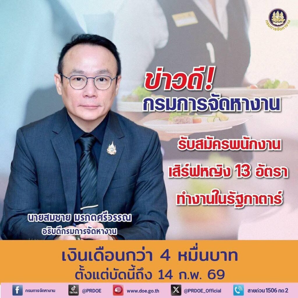 กรมการจัดหางาน เปิดรับสมัครสาวไทยทำงานในกาตาร์ ตำแหน่ง “พนักงานเสิร์ฟ” เงินเดือน 4 หมื่น+ สวัสดิการดี สมัครได้ถึงถึง 14 กุมภาพันธ์ 2569