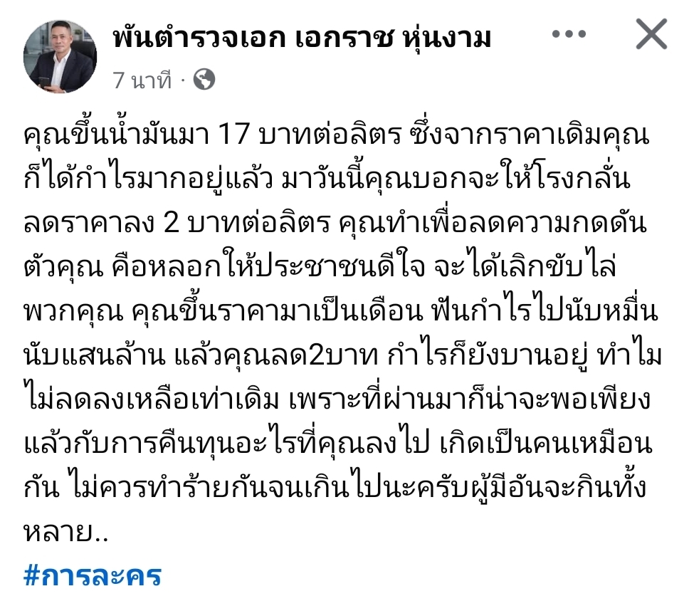 พ.ต.อ.เอกราช ชี้ ฟันกำไรไปนับหมื่นนับแสนล้าน แล้วคุณลด2บาท กำไรก็ยังบานอยู่ ทำไมไม่ลดลงเหลือเท่าเดิม