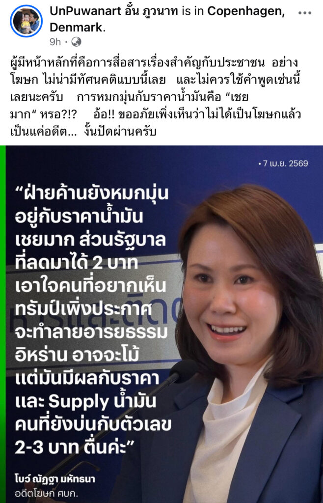 ผู้มีหน้าหลักที่คือการสื่อสารเรื่องสำคัญกับประชาชน อย่างโฆษก ไม่น่ามีทัศนคติแบบนี้เลย และไม่ควรใช้คำพูดเช่นนี้เลยนะครับ การหมกมุ่นกับราคาน้ำมันคือ “เชยมาก“ หรอ?!? อ้อ!! ขออภัยเพิ่งเห็นว่าไม่ได้เป็นโฆษกแล้ว เป็นแค่อดีต… งั้นปัดผ่านครับ