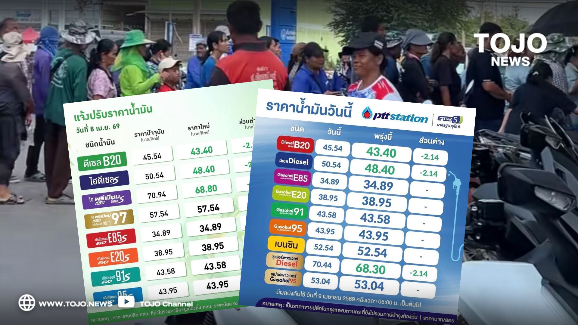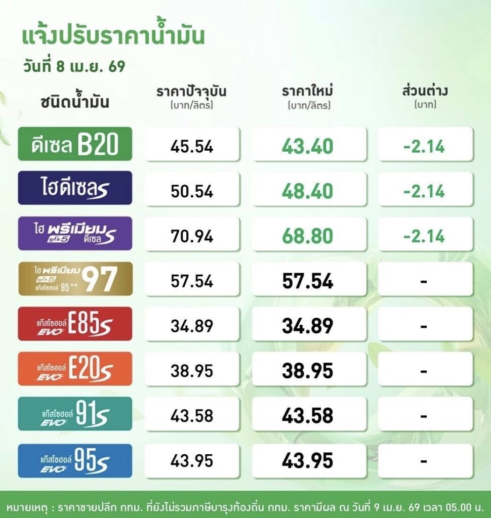 ผู้สื่อข่าวโตโจ้นิวส์รายงาน วันที่ 8 เม.ย.69 มีประกาศปรับราคาน้ำมัน PTT Station และ บางจาก ปรับราคาขายปลีกน้ำมันกลุ่ม