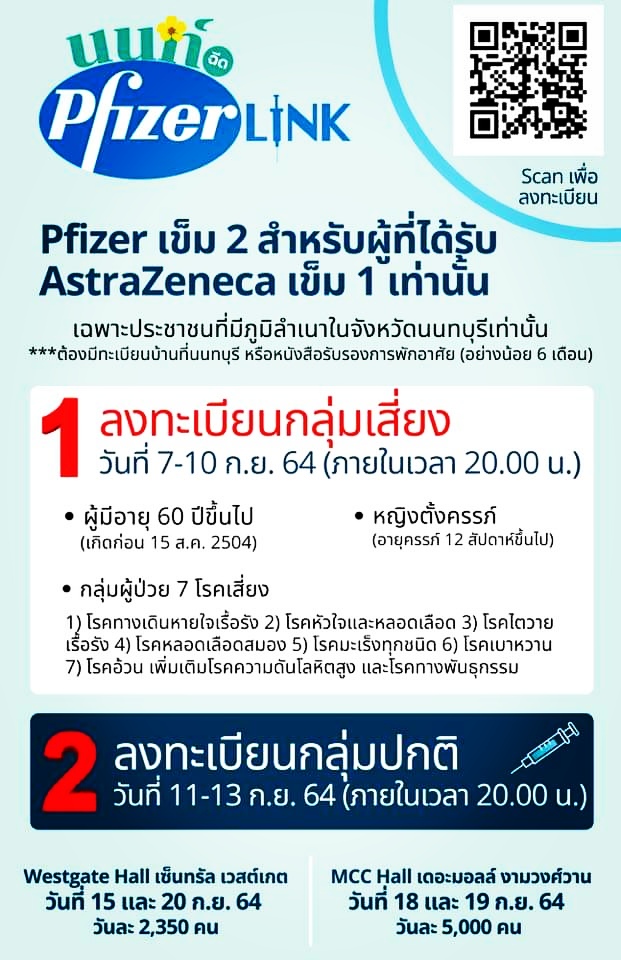 นนทบุรีเปิดลงทะเบียน ฉีดวัคซีนไฟเซอร์เข็มที่ 2 แล้ว รับเฉพาะผู้ที่ฉีดแอสตร้าฯ เข็ม 1 มาแล้ว