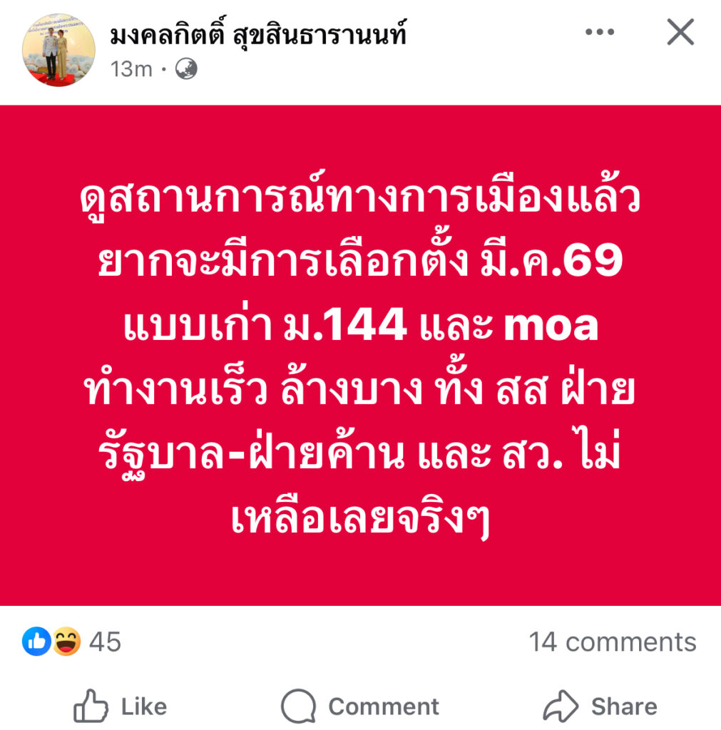 ดูสถานการณ์ทางการเมืองแล้ว ยากจะมีการเลือกตั้ง มี.ค.69 แบบเก่า ม.144 และ moa ทำงานเร็ว ล้างบาง ทั้ง สส ฝ่ายรัฐบาล-ฝ่ายค้าน และ สว. ไม่เหลือเลยจริงๆ