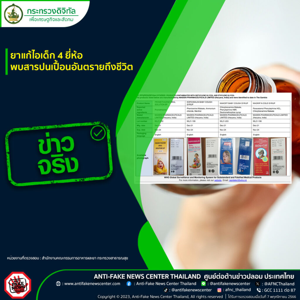 ผู้สื่อข่าวโตโจ้นิวส์รายงานว่า ตามที่มีการเผยแพร่ข้อมูลเกี่ยวกับเรื่องยาแก้ไอเด็ก 4 ยี่ห้อ พบสารปนเปื้อนอันตรายถึงชีวิต ทางศูนย์ต่อต้านข่าวปลอมได้ดำเนินการตรวจสอบข้อเท็จจริงโดยสำนักงานคณะกรรมการอาหารและยา กระทรวงสาธารณสุข พบว่าข้อมูลดังกล่าว เป็นข้อมูลจริง