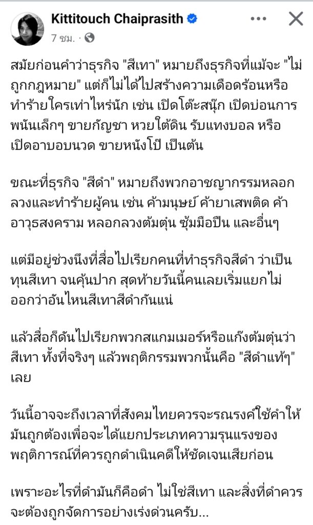 ดร.กิตติธัช จี้เรียก สีดำ มันก็คือดำ ไม่ใช่สีเทา และสิ่งที่ดำ ควรจะต้องถูกจัดการอย่างเร่งด่วน
