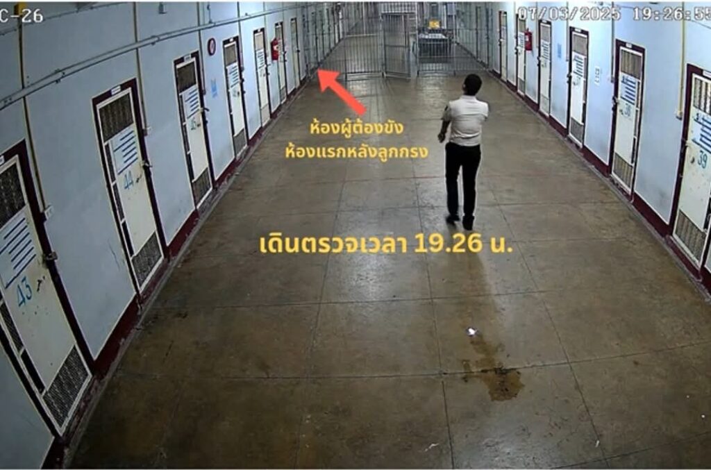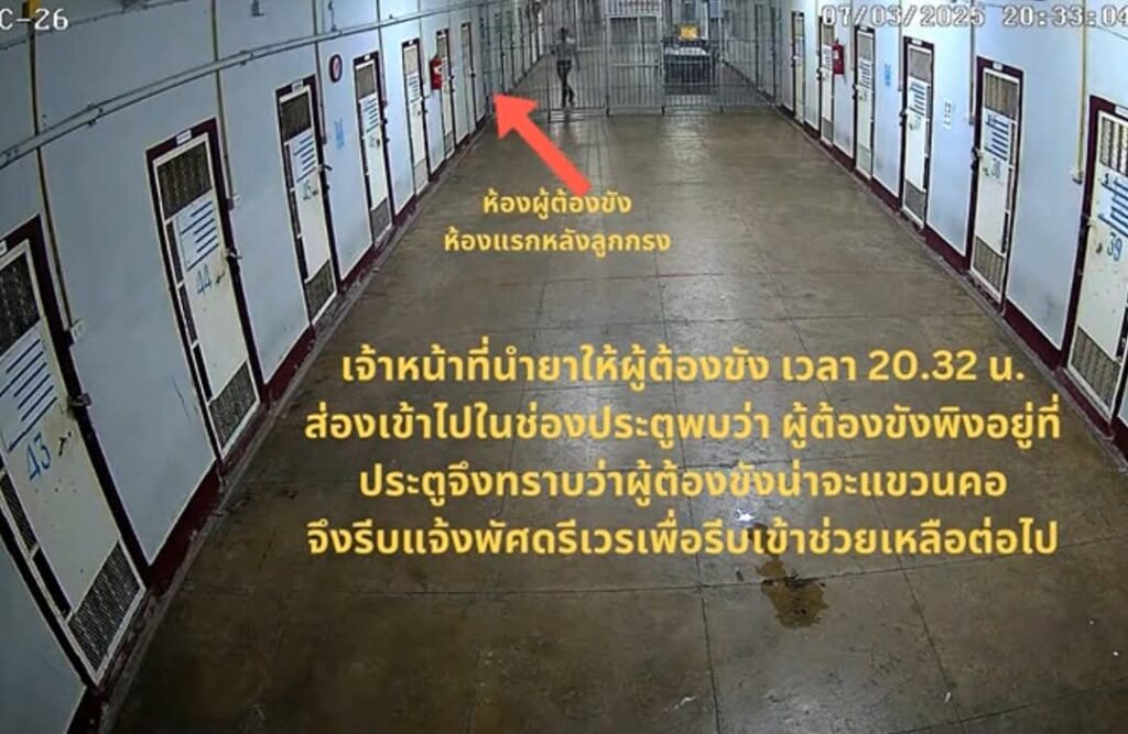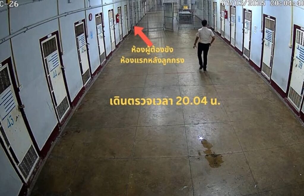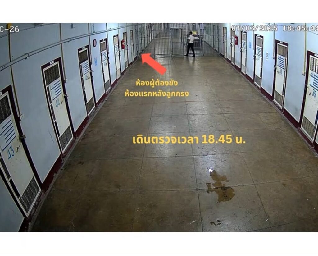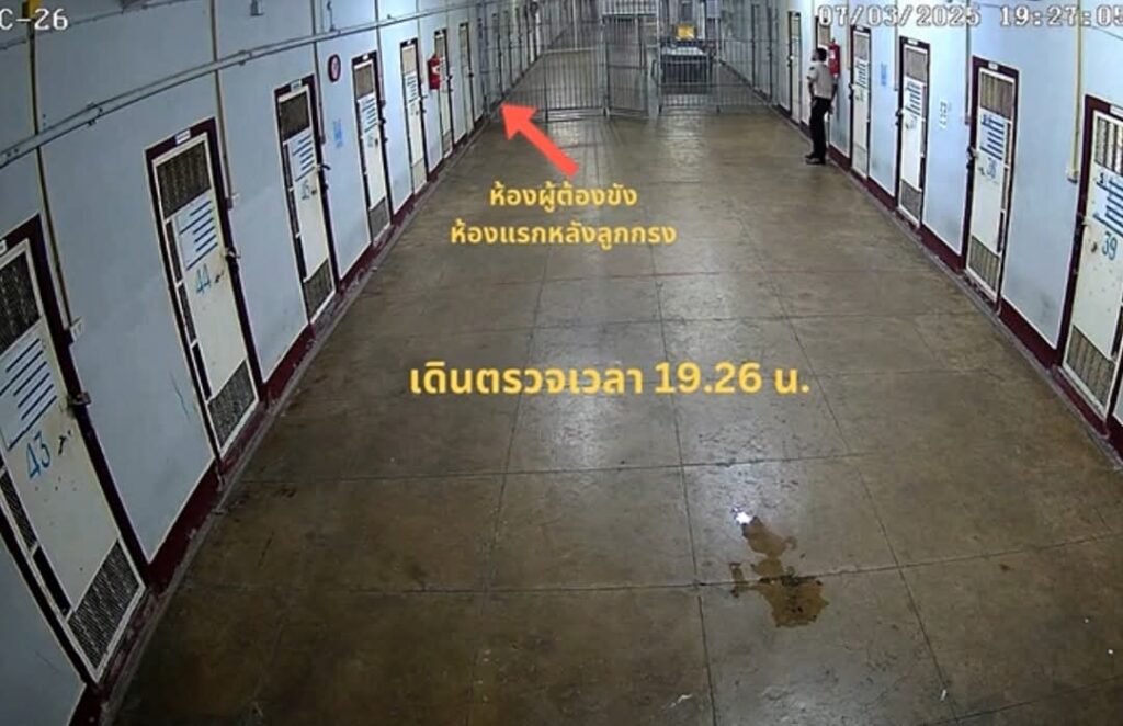โดยพบว่าห้องผู้ต้องขัง คือ ห้องแรกหลังลูกกรง ต่อมาเวลา 17.28 น. เจ้าหน้าที่ราชทัณฑ์มีการเดินตรวจและส่องดูผู้ต้องขัง และเดินตรวจอีกครั้งในเวลา 18.45 น. และเดินตรวจอีกครั้งในเวลา 19.26 น.