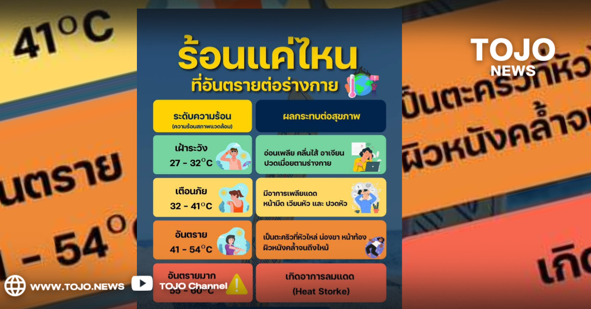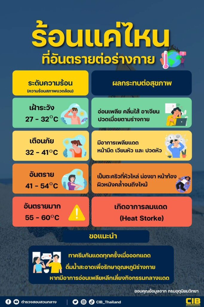ผู้สื่อข่าวโตโจ้นิวส์รายงานว่า ตำรวจสอบสวนกลาง (CIB) มีเกร็ดความรู้เกี่ยวกับเรื่องดัชนีความร้อนมาฝากทุกคนครับ ว่าความร้อนระดับไหน ที่ร่างกายของมนุษย์จะสามารถรับไหว เเละไม่เป็นอันตรายต่อร่างกาย โดยเราสามารถเเบ่งระดับความร้อนได้ดังนี้