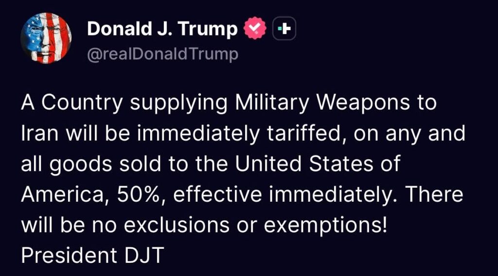 ประเทศใดก็ตามที่จัดหาอาวุธทางทหารให้กับอิหร่าน จะถูกเรียกเก็บภาษีทันที สำหรับสินค้าทุกชนิดที่ขายให้กับสหรัฐอเมริกา ในอัตรา 50% และมีผลบังคับใช้ทันที จะไม่มีข้อยกเว้นหรือการผ่อนผันใด ๆ ทั้งสิ้น!