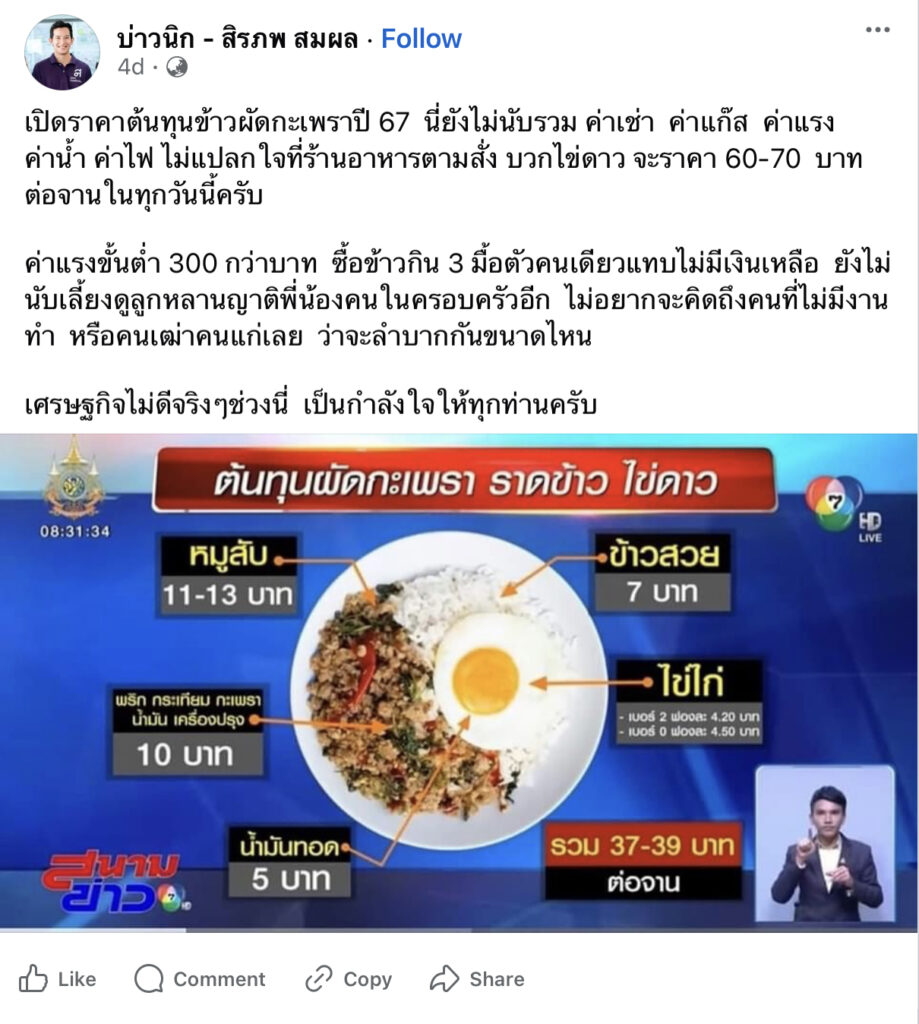 บ่าวนิก ช็อก ราคาต้นทุนกะเพราสมัยนี้สูงถึง 39 บาทต่อจาน ทำราคาอาหารสูงตาม ลั่น ค่าแรงขั้นต่ำ 300 บาท จะอยู่กันลำบากขนาดไหน