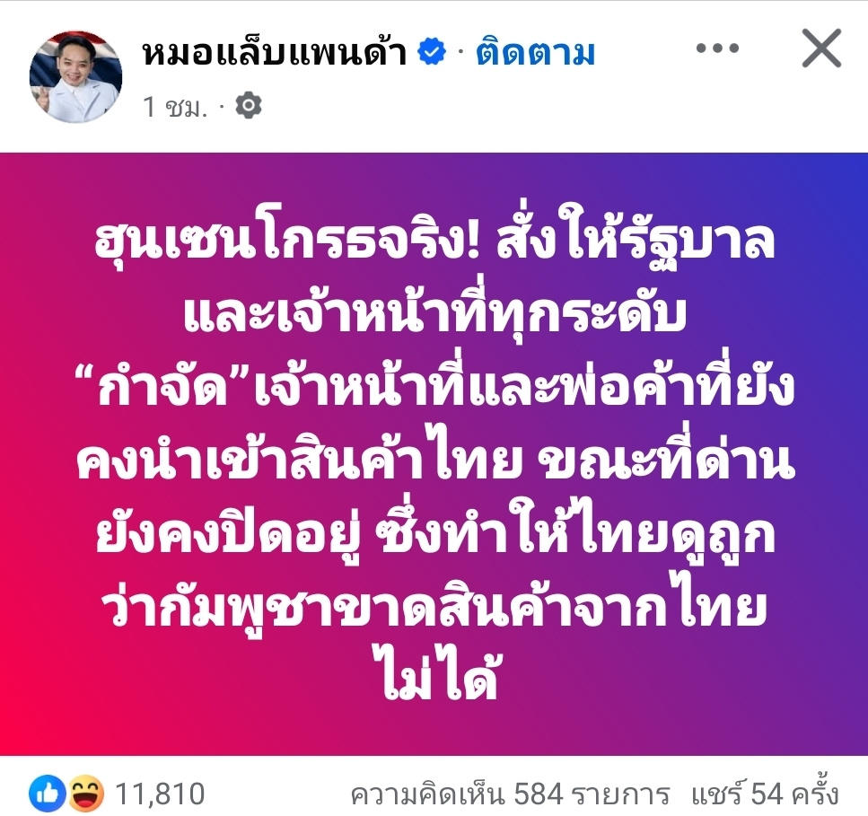 หมอแล็บแพนด้า เผย ฮุนเซน “กำจัด”เจ้าหน้าที่และพ่อค้าที่ยังคงนำเข้าสินค้าไทย