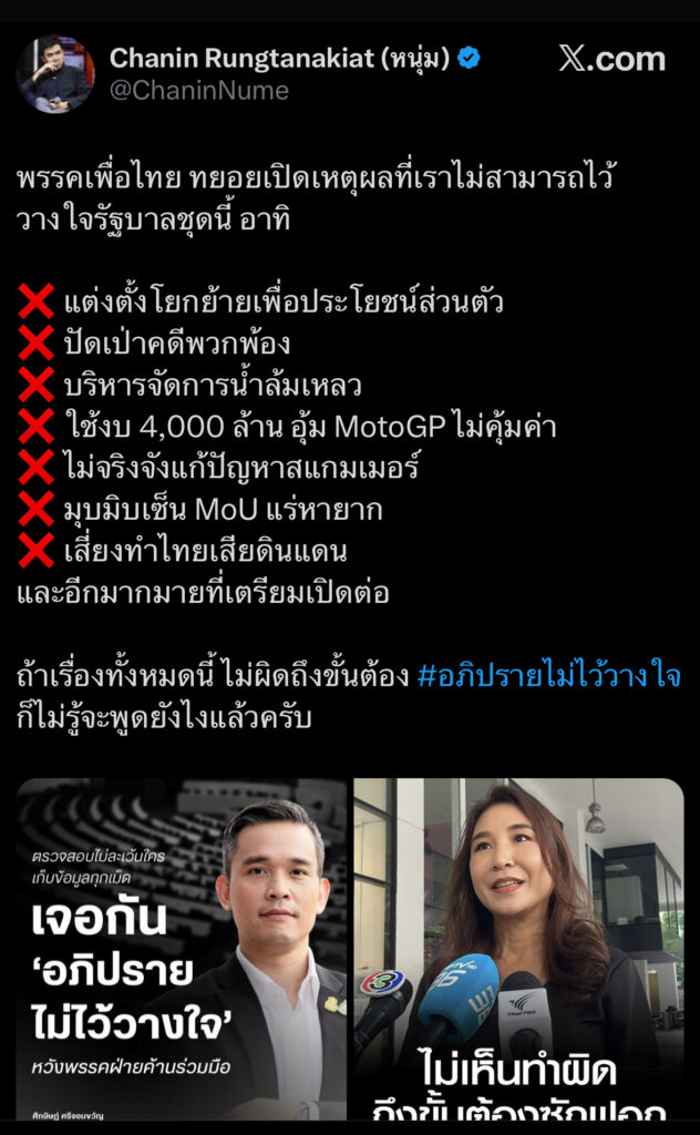 พรรคเพื่อไทย ทยอยเปิดเหตุผลที่เราไม่สามารถไว้วางใจรัฐบาลชุดนี้ อาทิ