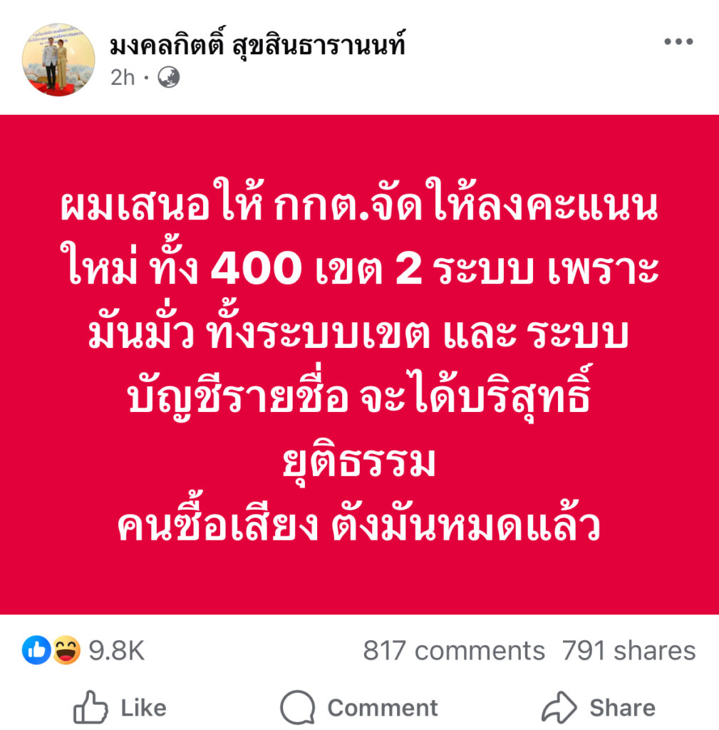 ผมเสนอให้ กกต.จัดให้ลงคะแนนใหม่ ทั้ง 400 เขต 2 ระบบ เพราะมันมั่ว ทั้งระบบเขต และ ระบบบัญชีรายชื่อ จะได้บริสุทธิ์ยุติธรรม