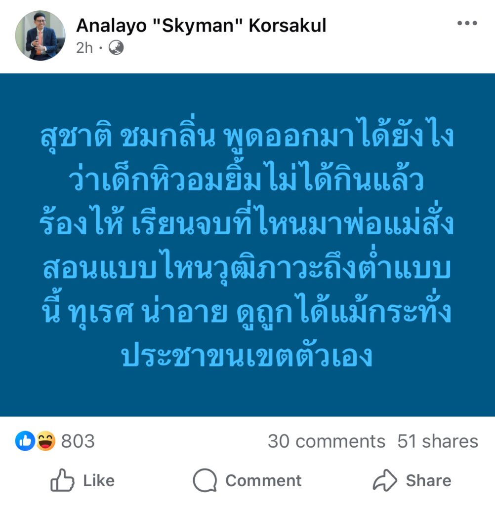 สุชาติ ชมกลิ่น พูดออกมาได้ยังไงว่าเด็กหิวอมยิ้มไม่ได้กินแล้วร้องไห้ เรียนจบที่ไหนมาพ่อแม่สั่งสอนแบบไหนวุฒิภาวะถึงต่ำแบบนี้ ทุเรศ น่าอาย ดูถูกได้แม้กระทั่งประชาขนเขตตัวเอง