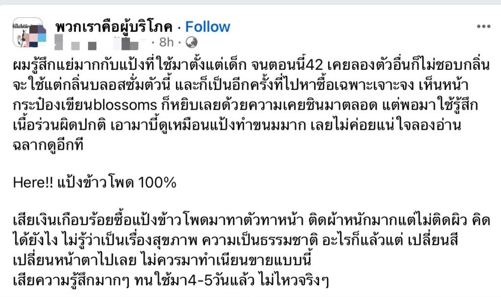 ผมรู้สึกแย่มากกับแป้งที่ใช้มาตั้งแต่เด็ก จนตอนนี้42 เคยลองตัวอื่นก็ไม่ชอบกลิ่น จะใช้แต่กลิ่นบลอสซั่มตัวนี้ และก็เป็นอีกครั้งที่ไปหาซื้อเฉพาะเจาะจง เห็นหน้ากระป๋องเขียนblossoms ก็หยิบเลยด้วยความเคยชินมาตลอด แต่พอมาใช้รู้สึกเนื้อร่วนผิดปกติ เอามาบี้ดูเหมือนแป้งทำขนมมาก เลยไม่ค่อยแน่ใจลองอ่านฉลากดูอีกที