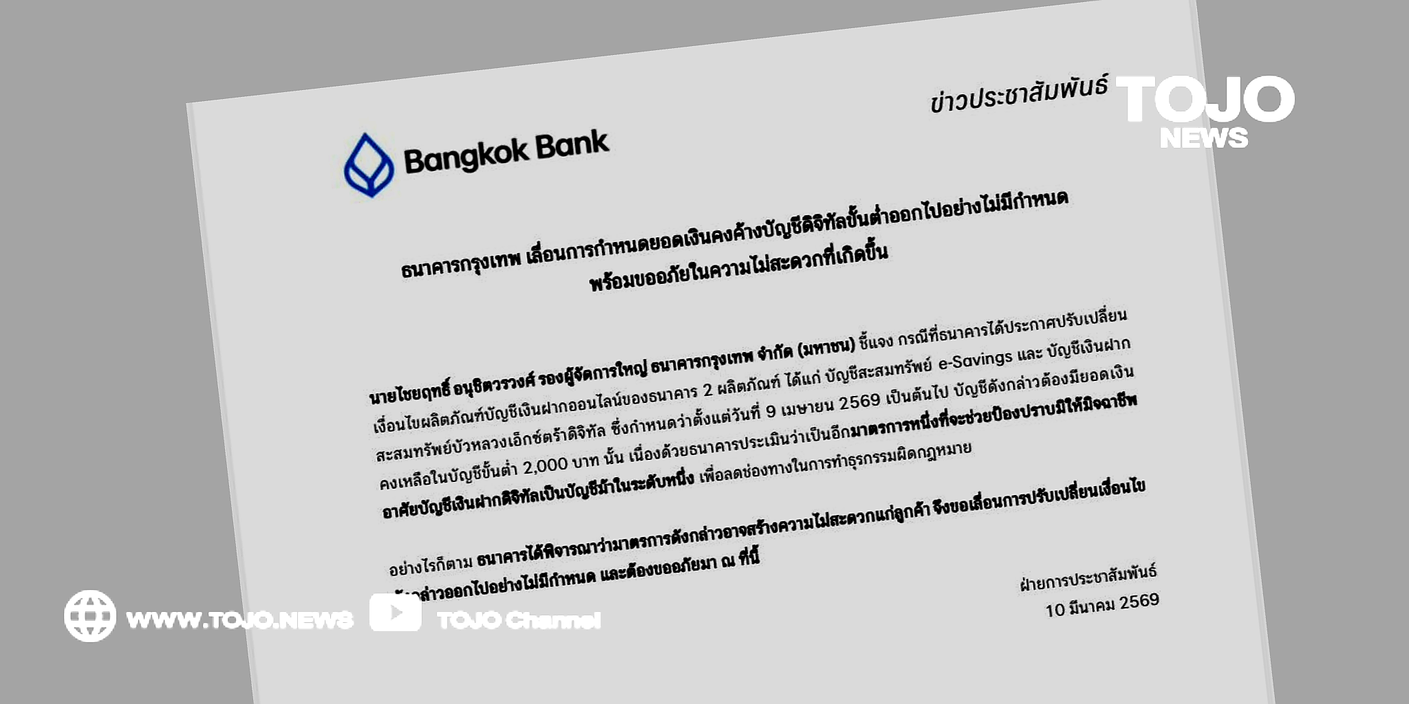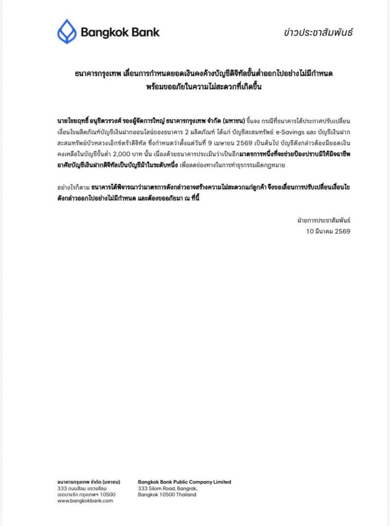 ผู้สื่อข่าวโตโจ้นิวส์รายงานว่า วันที่ 10 มี.ค.69 นายไชยฤทธิ์ อนุชิตวรวงศ์ รองผู้จัดการใหญ่ ธนาคารกรุงเทพ จำกัด (มหาชน) ชี้แจง กรณีที่ธนาคารได้ประกาศปรับเปลี่ยนเงื่อนไขผลิตภัณฑ์บัญชีเงินฝากออนไลน์ของธนาคาร 2 ผลิตภัณฑ์ ได้แก่ บัญชีสะสมทรัพย์ e-Savings และ บัญชีเงินฝากสะสมทรัพย์บัวหลวงเอ็กซ์ตร้าดิจิทัล ซึ่งกำหนดว่าตั้งแต่วันที่ 9 เมษายน 2569 เป็นต้นไป บัญชีดังกล่าวต้องมียอดเงินคงเหลือในบัญชีขั้นต่ำ 2,000 บาท นั้น