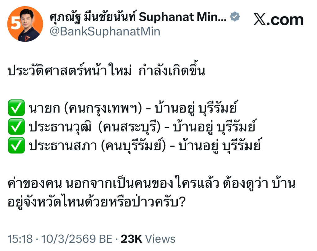 สส.แบงค์ ชี้ ประวัติศาสตร์หน้าใหม่ นายกฯ – ประธานสภาฯ – ประธานวุฒิฯ บ้านอยู่บุรีรัมย์ เหมือนกันหมด