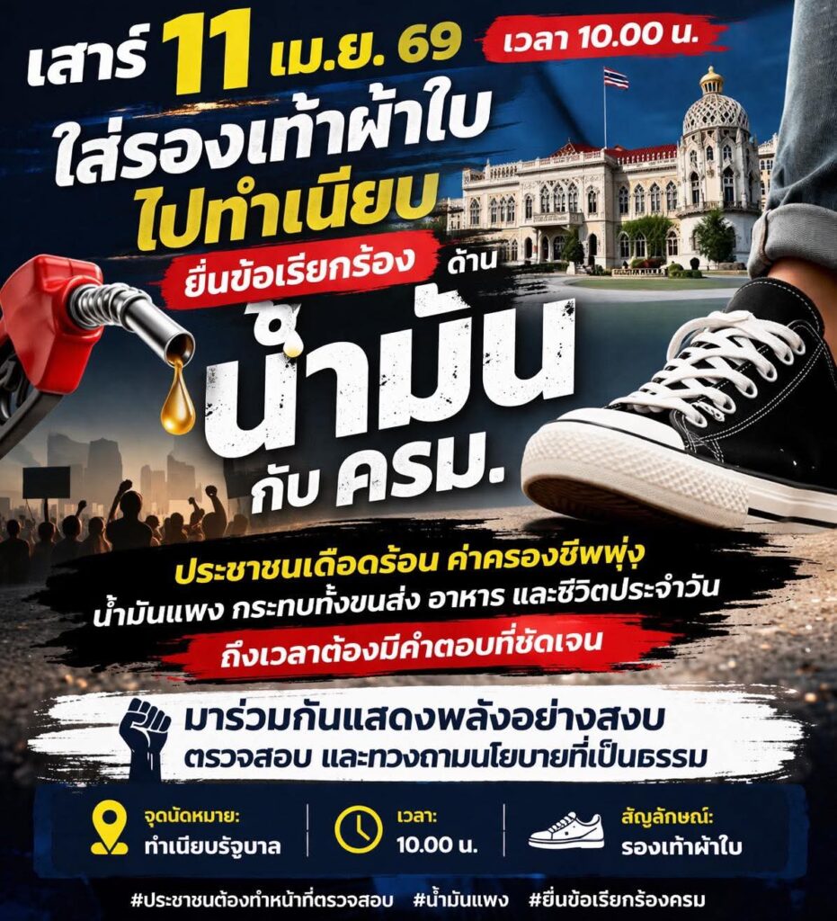 เสาร์ 11 เม.ย.69 เวลา 10.00 น ใส่รองเท้าผ้าใบไปทำเนียบ ยื่นข้อเรียกร้องด้านน้ำมันกับ ครม.