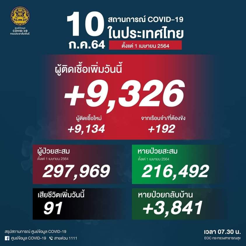 สรุปยอดผู้ติดเชื้อวันนี้ 10 ก.ค.64 พบรายใหม่ 9,326 เสียชีวิต 91 ราย