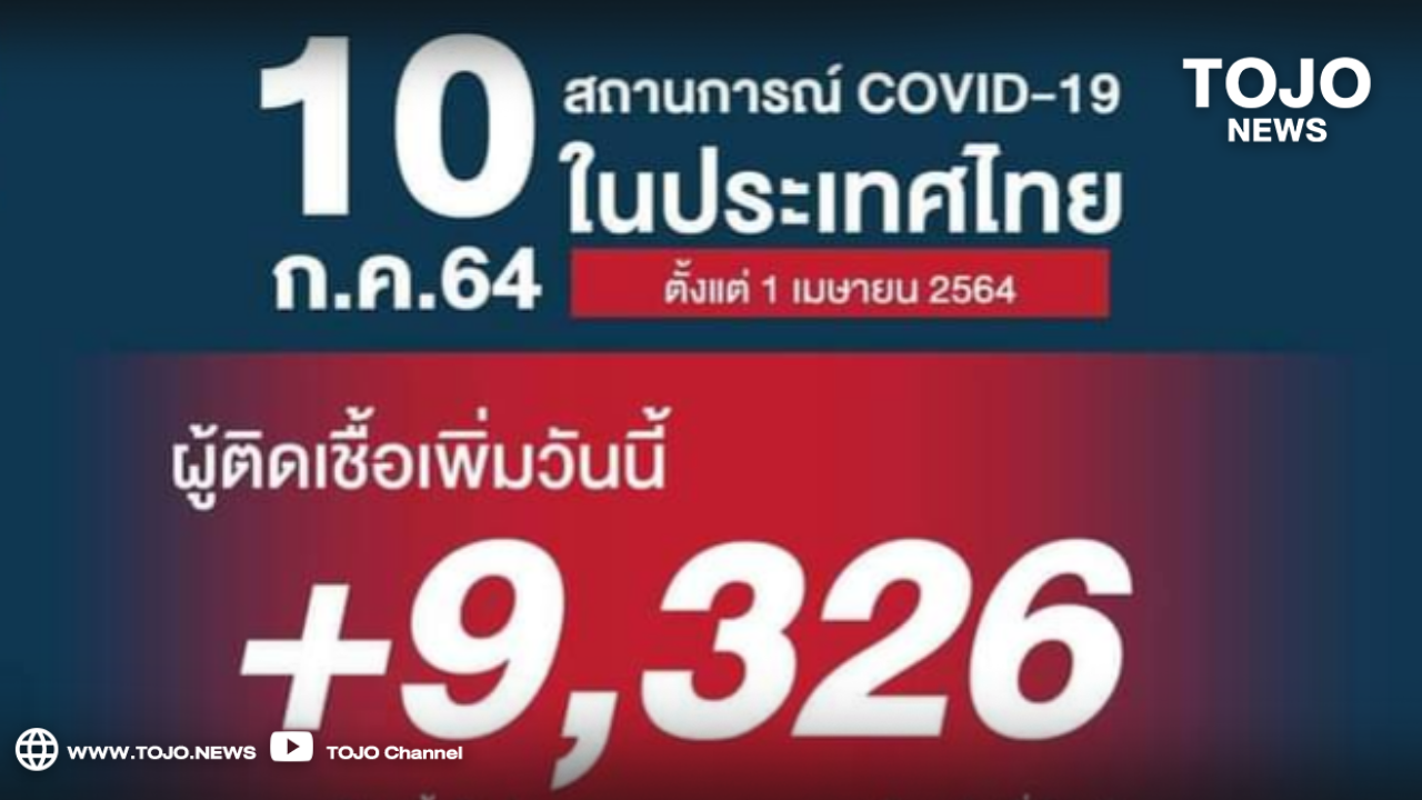 ผู้สื่อข่าวโตโจ้นิวส์รายงานว่า ศบค.รายงานสถานการณ์ผู้ติดเชื้อโควิด-19 รายวันประจำวันเสาร์ที่ 10 ก.ค. 64 พบว่า ผู้ติดเชื้อรวม 9,326 ราย จำแนกเป็น
