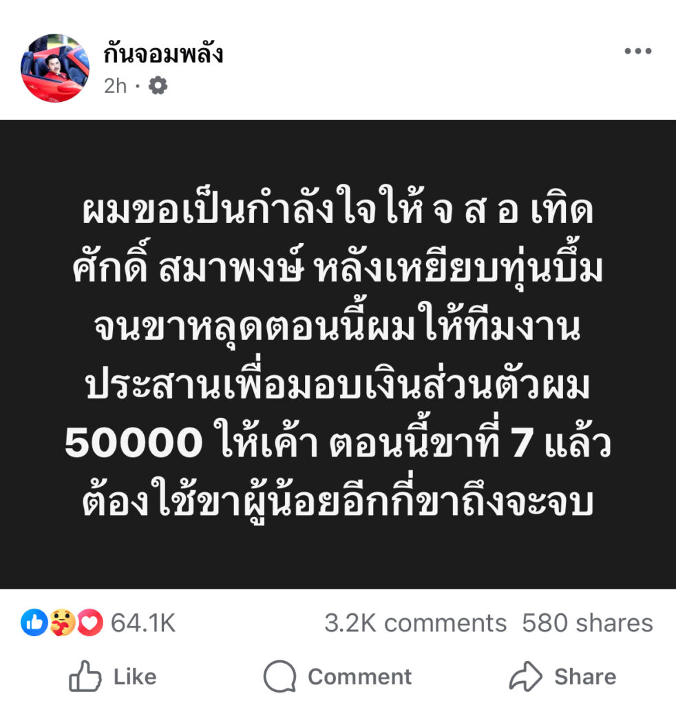 ล่าสุด นายกัณฐัศว์ พงศ์ไพบูลย์เวชย์ หรือกัน จอมพลัง โพสต์ข้อความผ่านเฟซบุ๊ก ระบุว่า