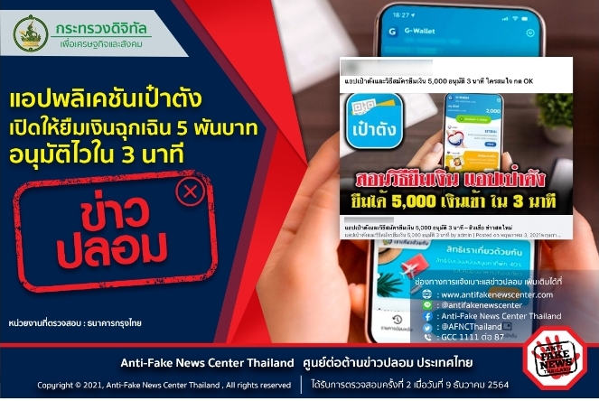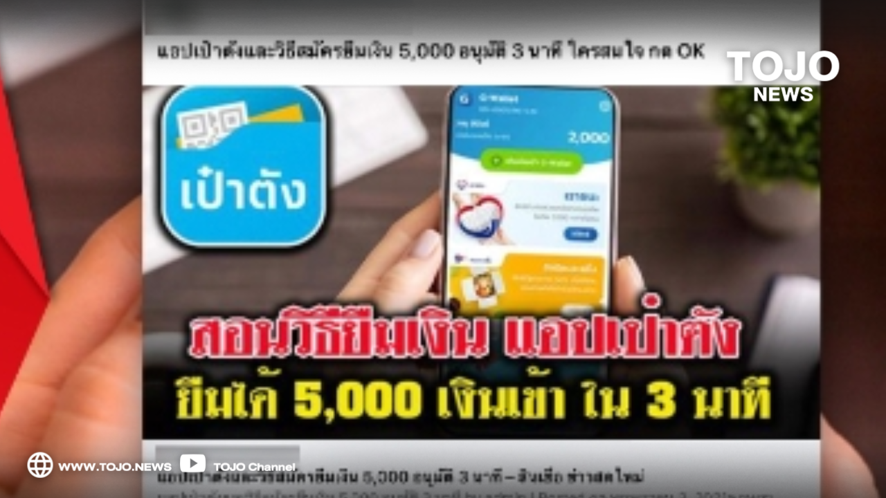ผู้สื่อข่าวโตโจ้นิวส์รายงานว่า ตามที่มีข่าวสารปรากฏในช่องทางต่าง ๆ เกี่ยวกับประเด็นเรื่อง แอปพลิเคชันเป๋าตัง เปิดให้ยืมเงินฉุกเฉิน 5 พันบาท อนุมัติไวใน 3 นาที ทางศูนย์ต่อต้านข่าวปลอมได้ดำเนินการตรวจสอบข้อเท็จจริงโดย ธนาคารกรุงไทย พบว่าประเด็นดังกล่าวนั้น เป็นข้อมูลเท็จ