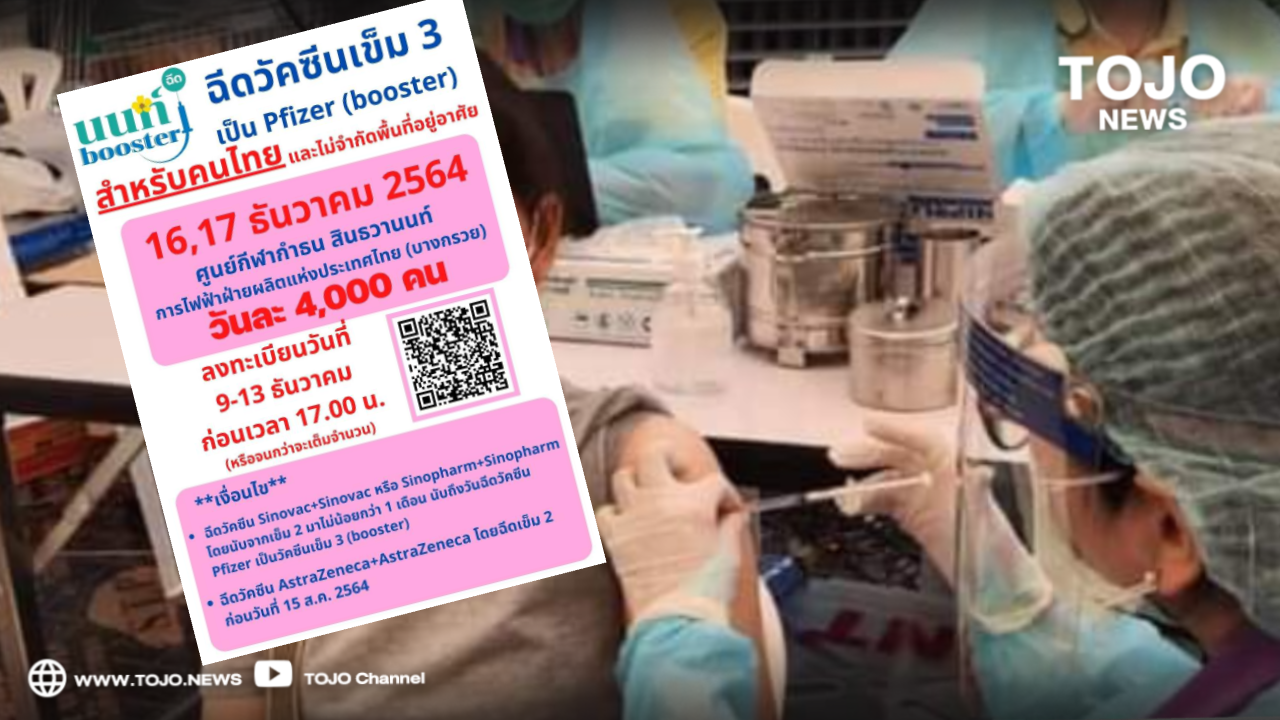 ผู้สื่อข่าวโตโจ้นิวส์รายงานว่า นนท์ booster” Pfizer จัดฉีดวัคซีนเข็ม 3 เป็น Pfizer (booster) สำหรับคนไทย และไม่จำกัดพื้นที่อยู่อาศัย