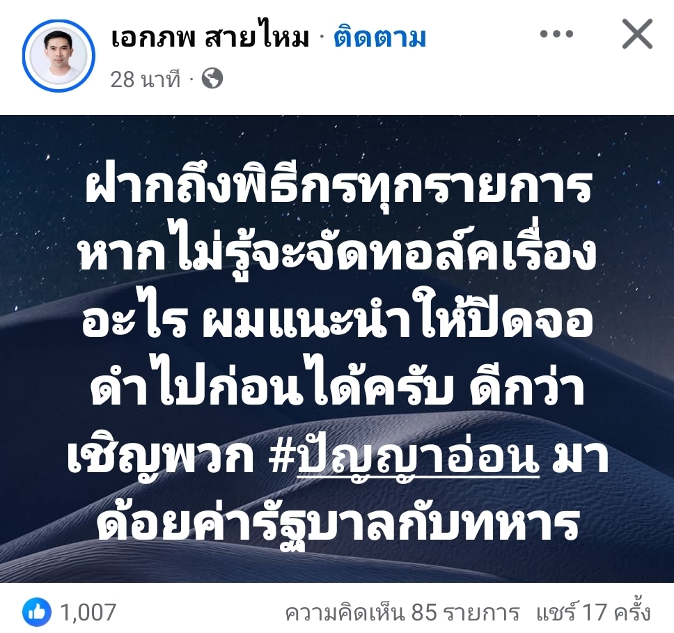 ฝากถึงพิธีกรทุกรายการ หากไม่รู้จะจัดทอล์คเรื่องอะไร ผมแนะนำให้ปิดจอดำไปก่อนได้ครับ ดีกว่าเชิญพวก ปัญญาอ่อน มาด้อยค่ารัฐบาลกับทหาร